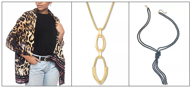 This will be a recurring theme for Sam because many necklines can create a horizontal line right where she doesn’t want one. There are two ways to transform the design: layering clothes and layering accessories.